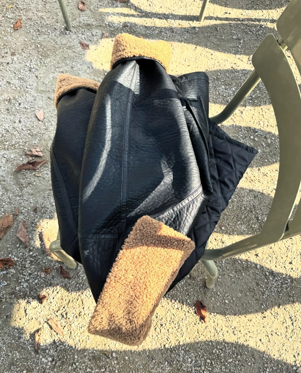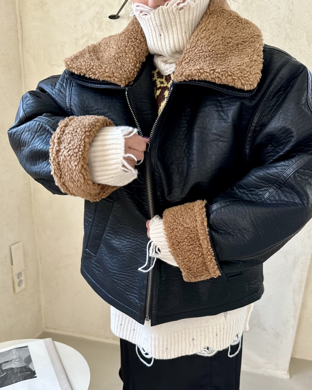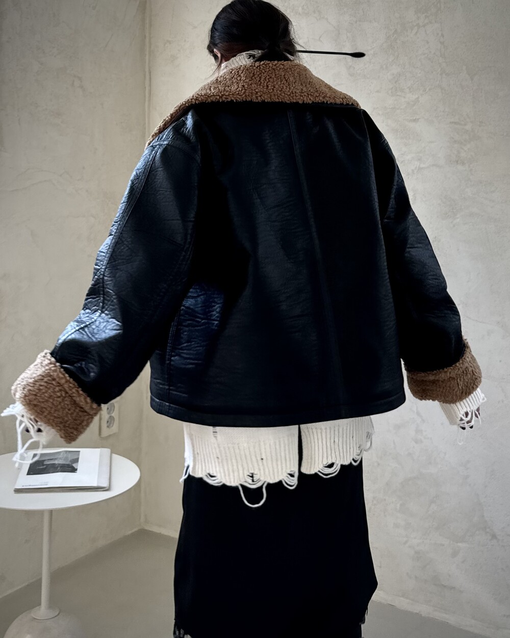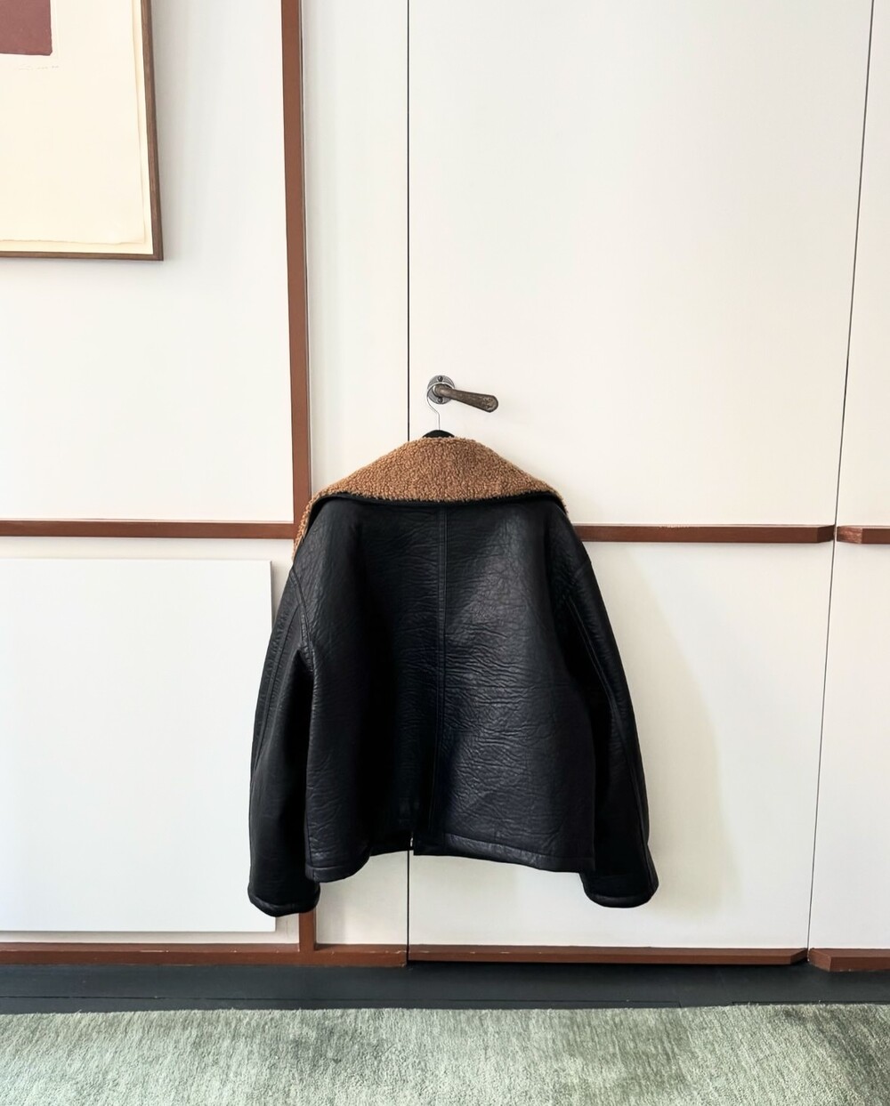 이 무스탕은 텍스처가 느껴지는 디테일을 살린 비건 레더.
